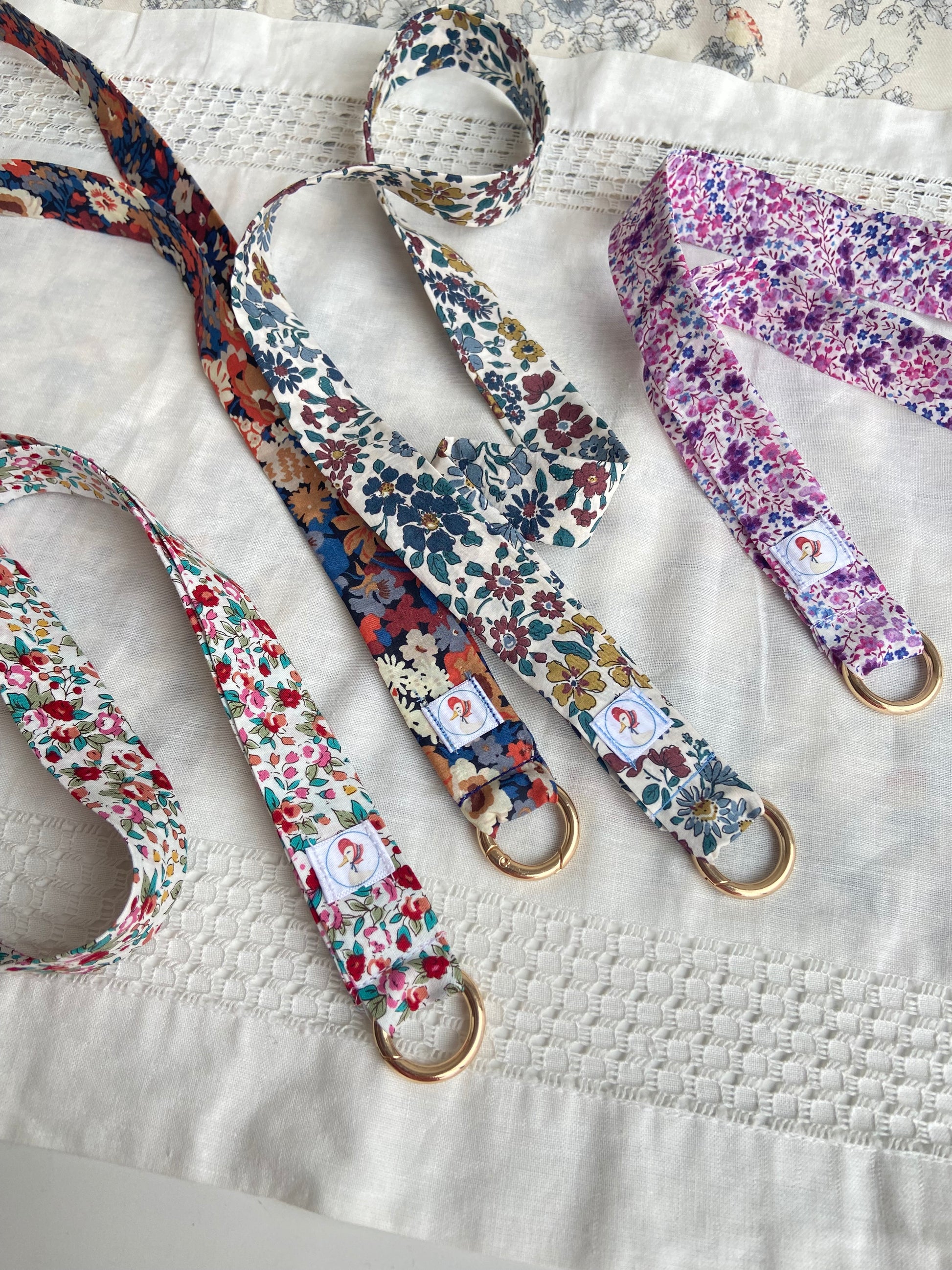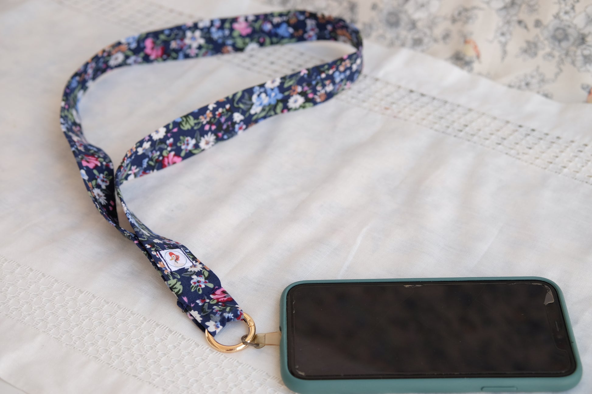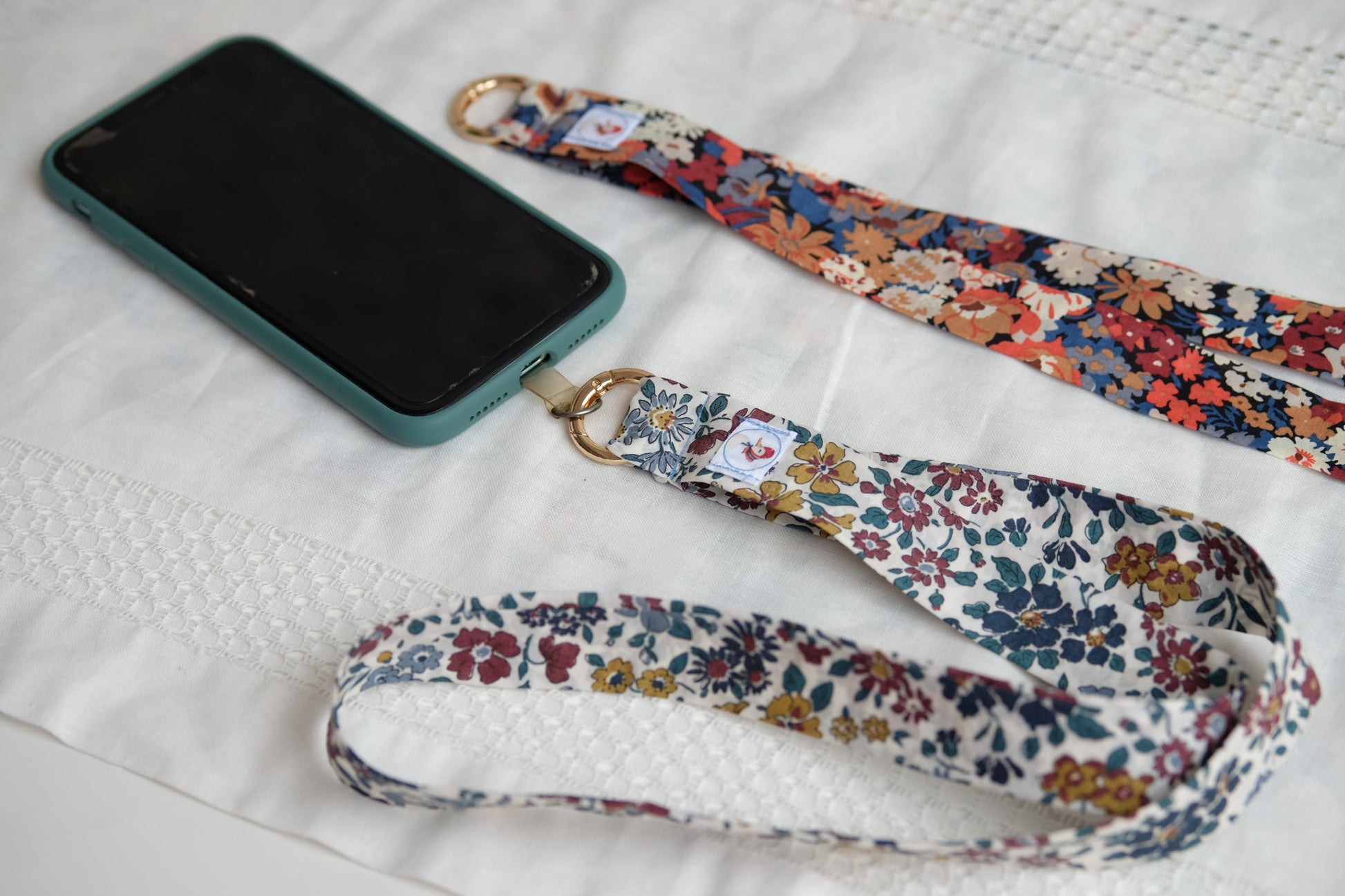 Cintas de tela de diferentes estampado para colgar el móvil, van con una anilla dorada que se abre para unir al móvil, por lo que también se puede quitar para lavar la cinta.