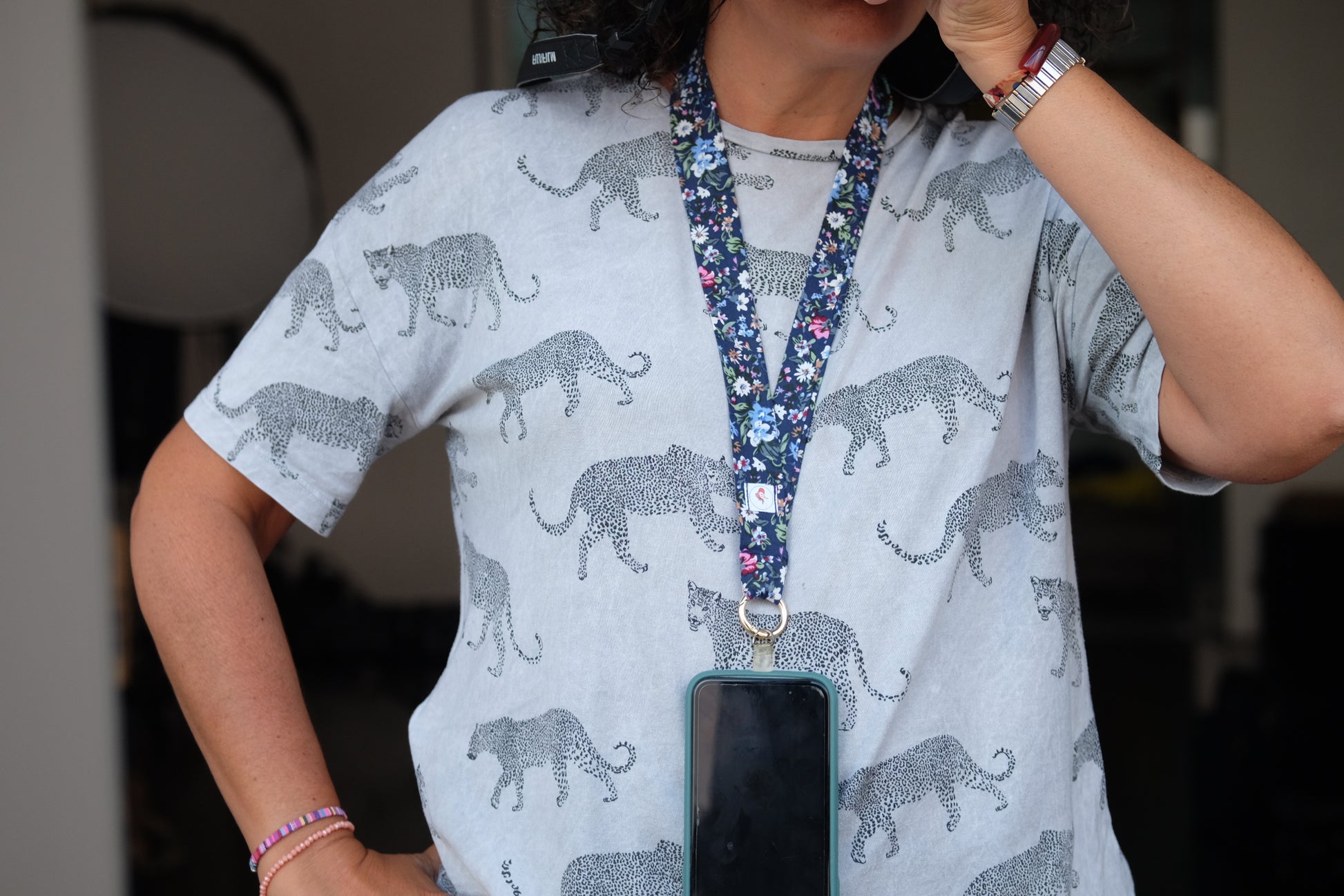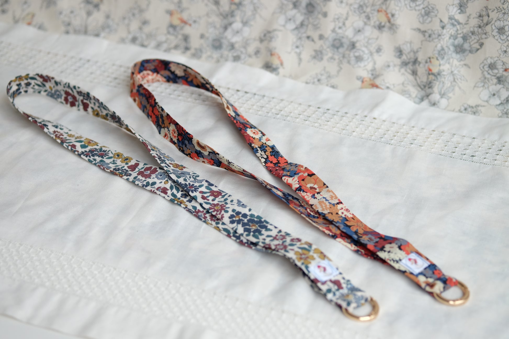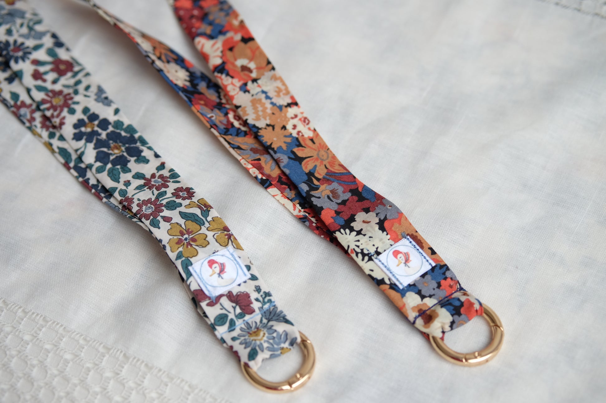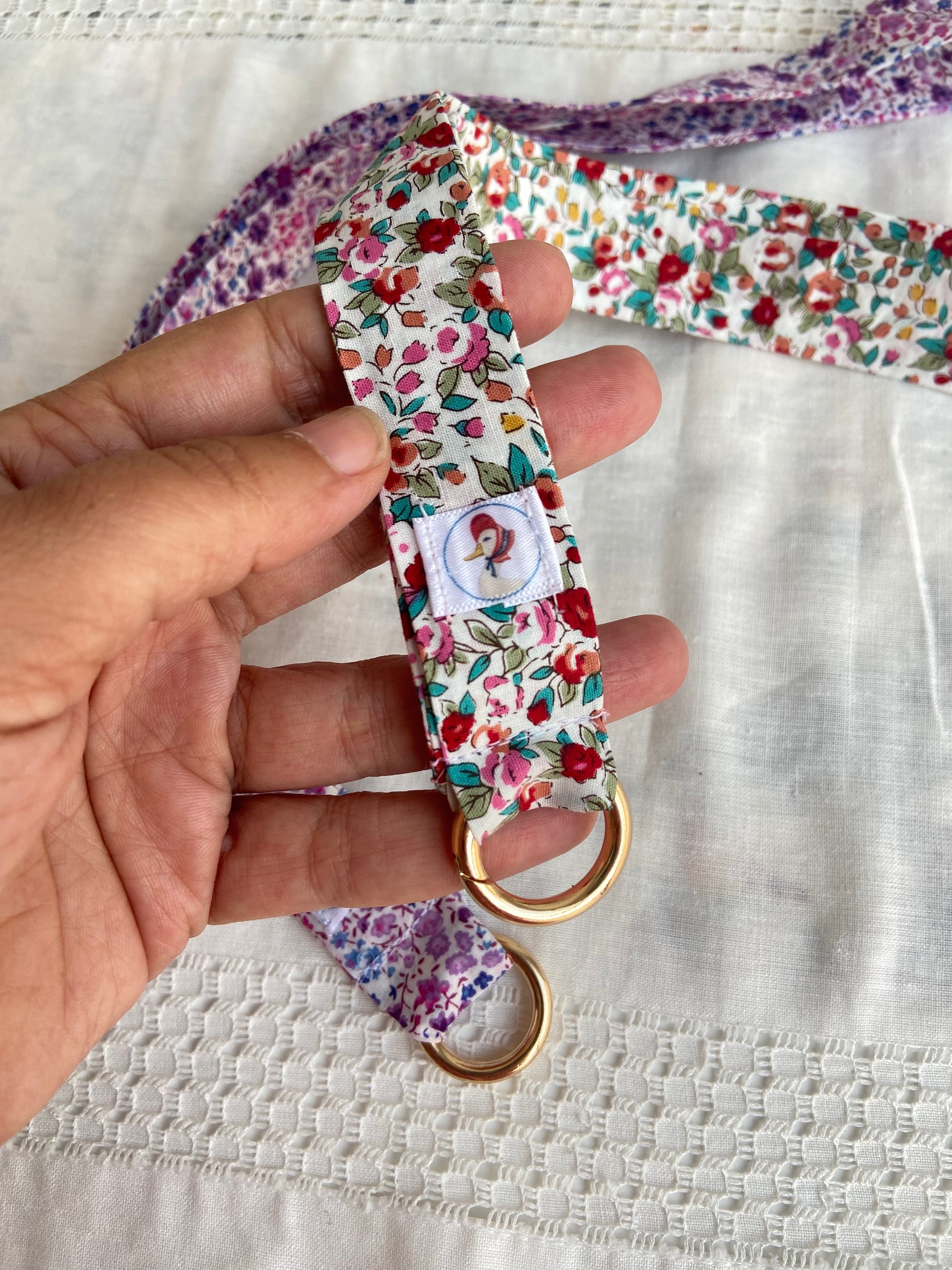 Cintas de tela de diferentes estampado para colgar el móvil, van con una anilla dorada que se abre para unir al móvil, por lo que también se puede quitar para lavar la cinta.