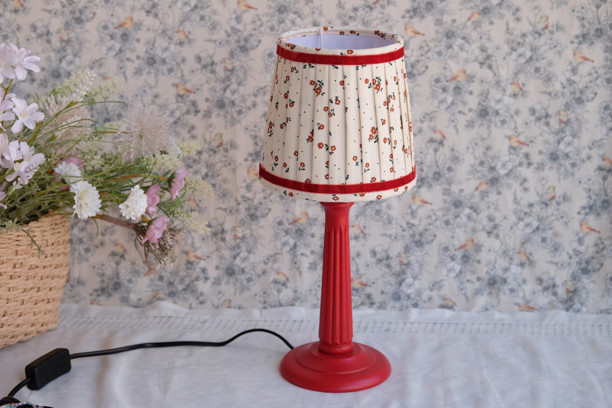 Lamparita de mesa con base de madera de olmo pintada a mano y tulipa de flores rosas con volante fruncido.