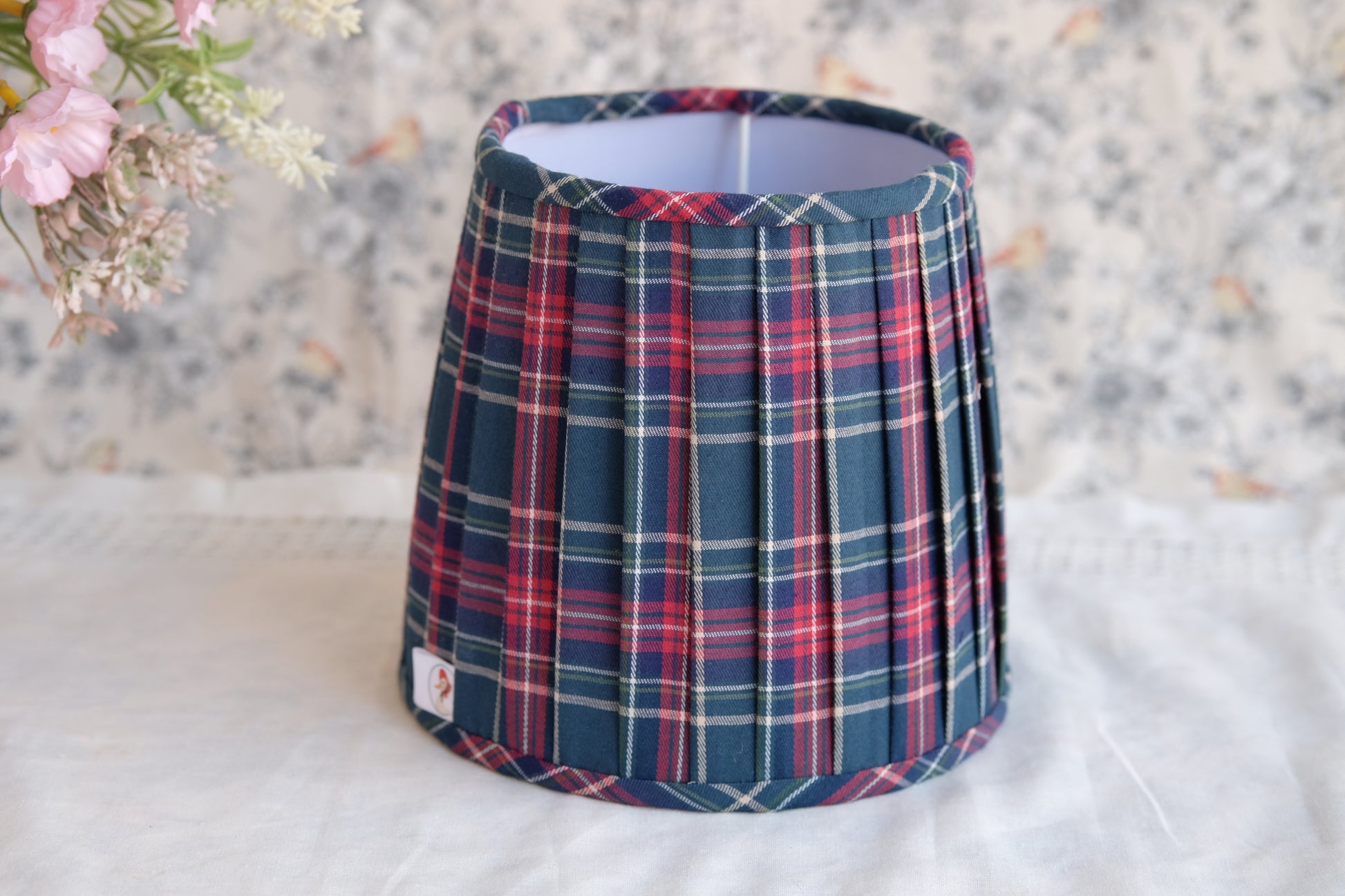 Tulipa plisada escocesa en tonos verdes, rojo y azul marino. Ideal para una lamparita de mesa o un aplique de pared.