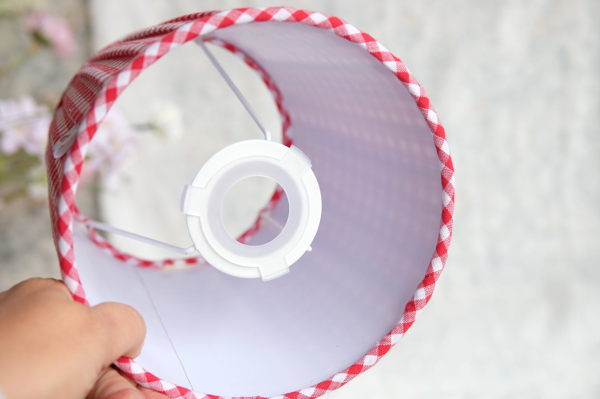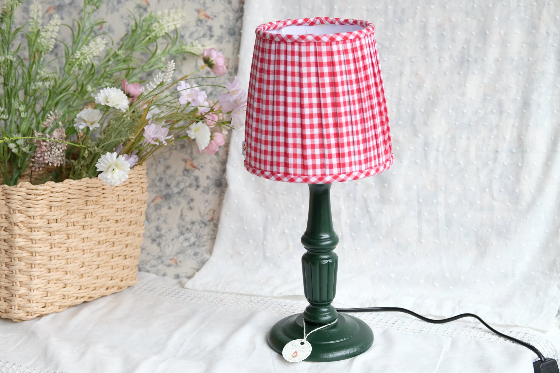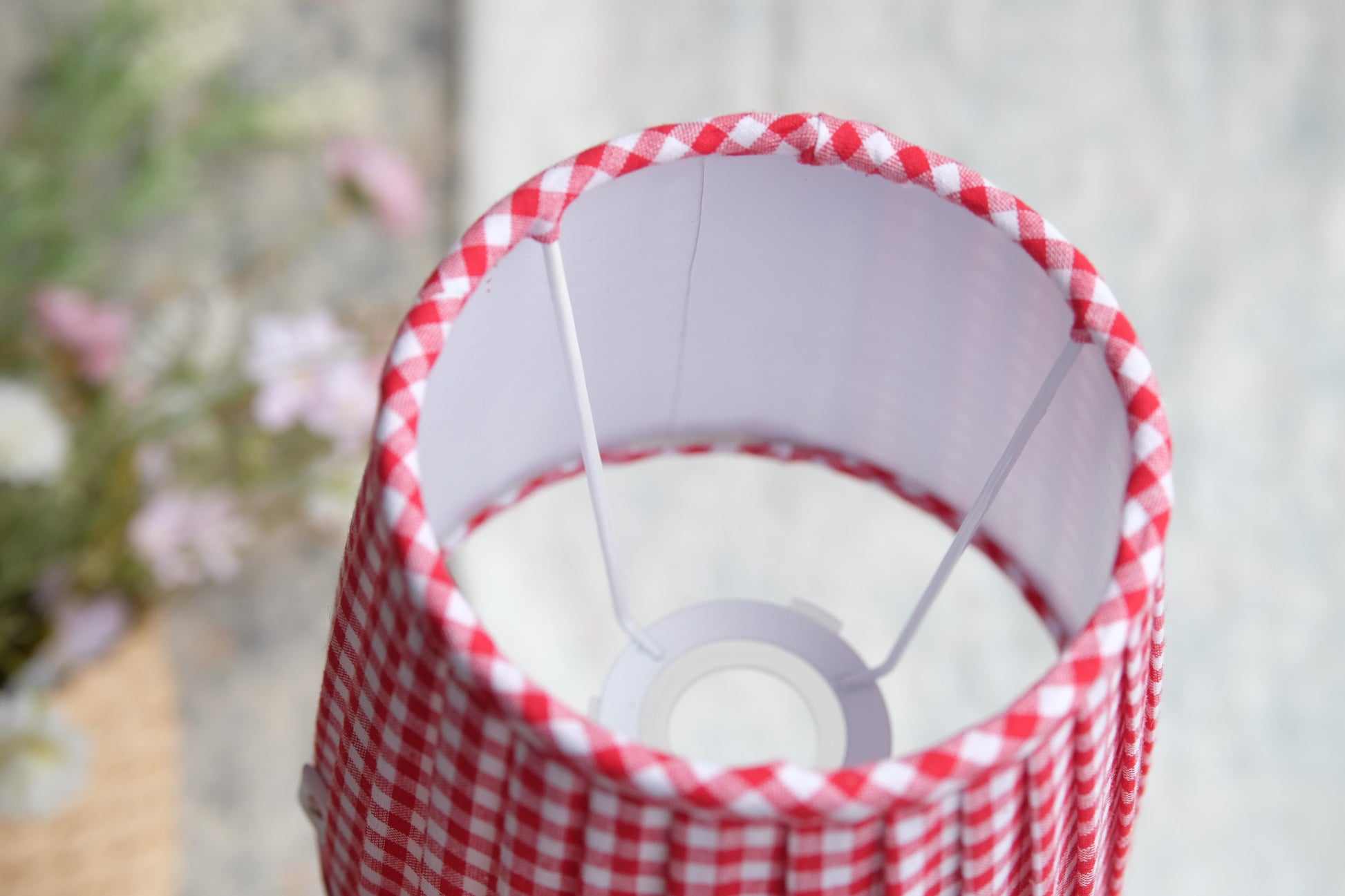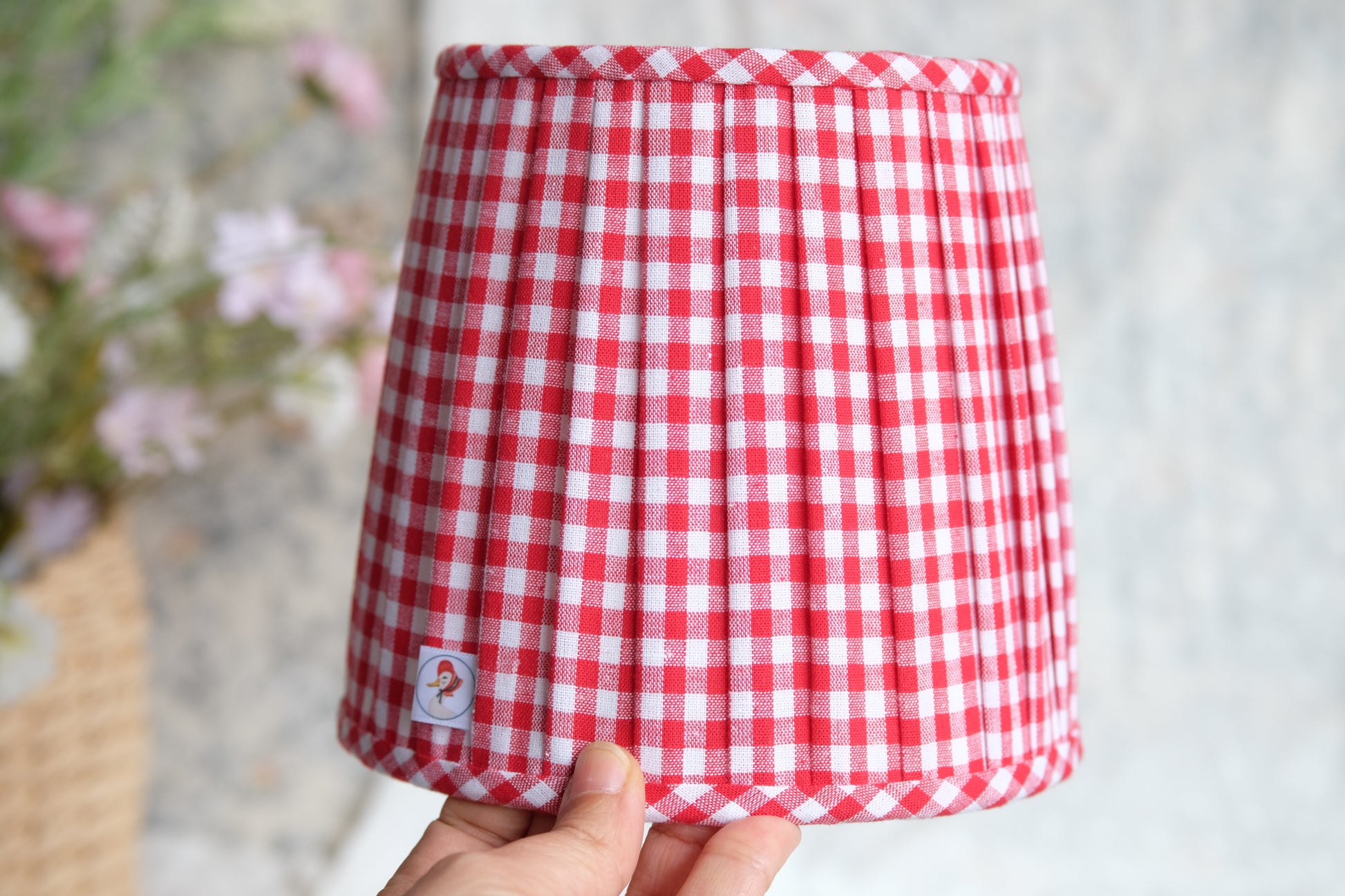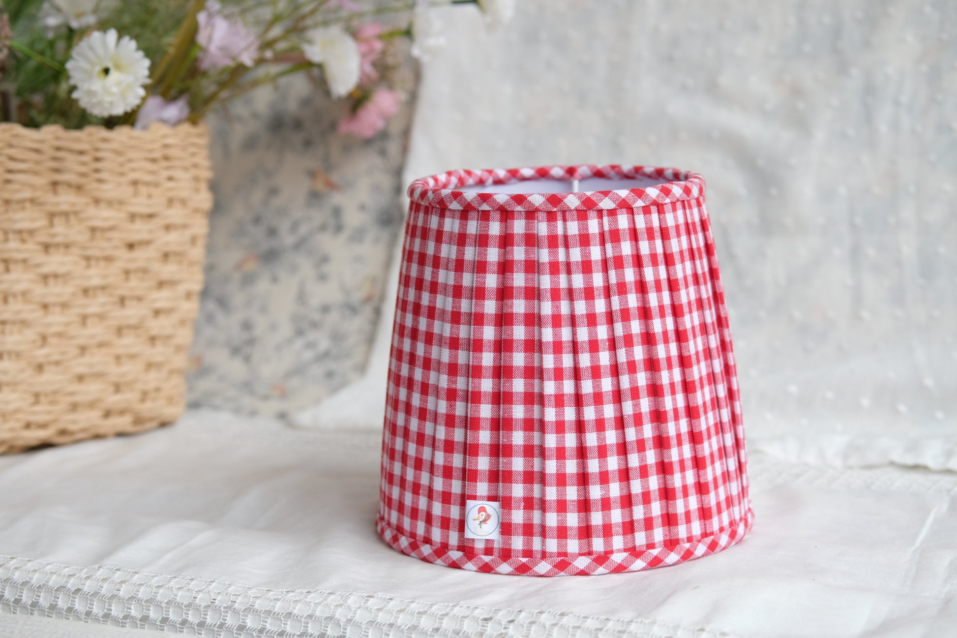 Tulipa plisada de algodón 100% con estampado de vichy de 5mm, de color rojo. Ideal para lamparitas de mesa o apliques de pared.