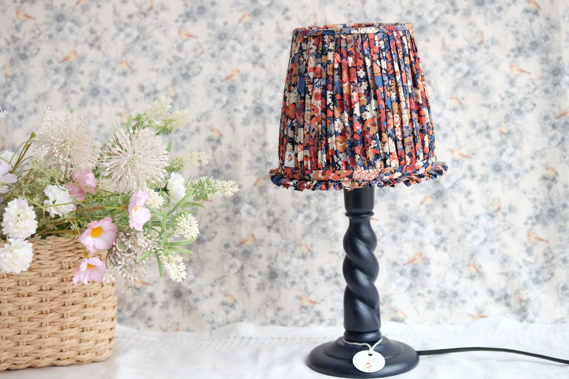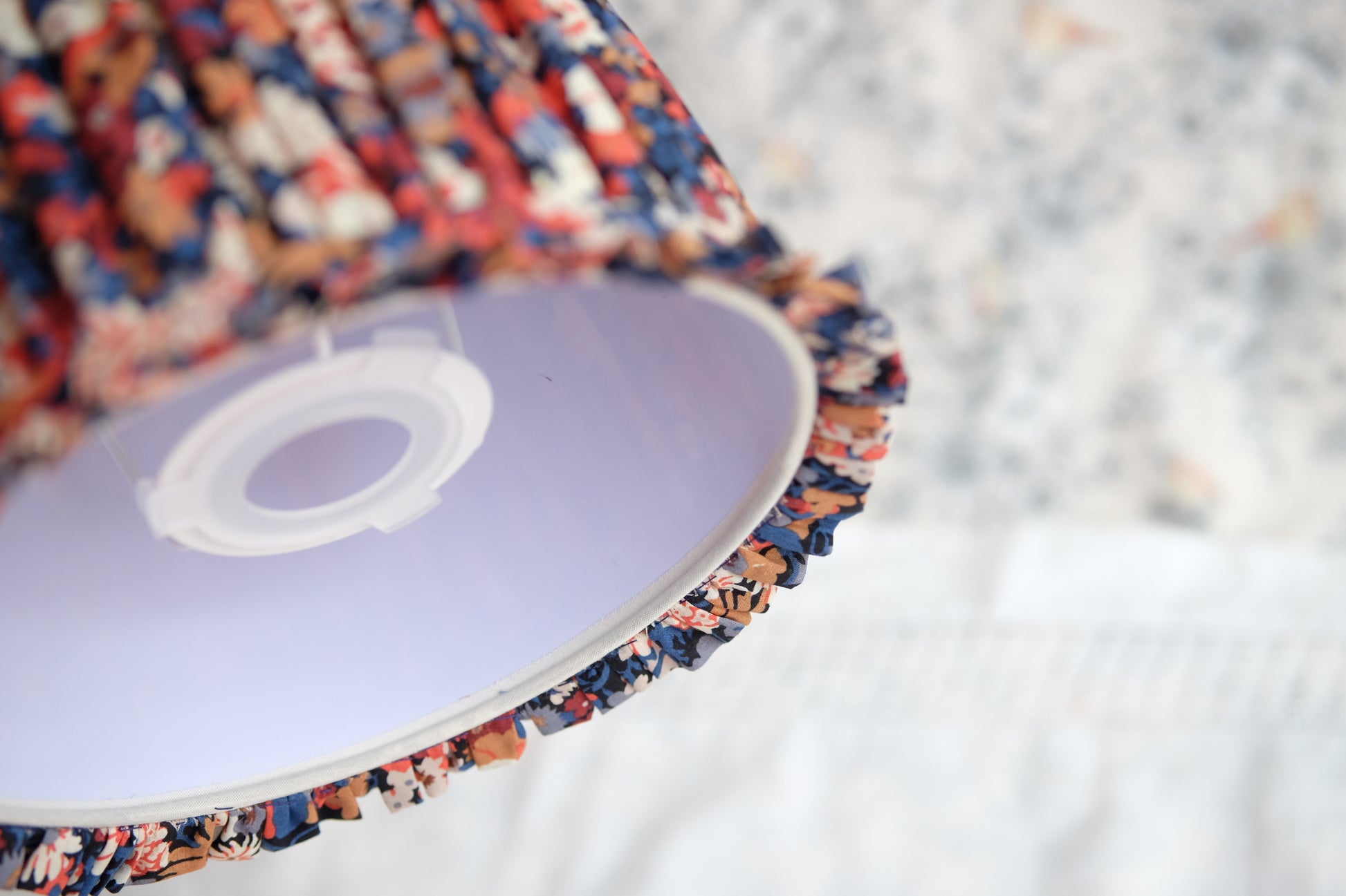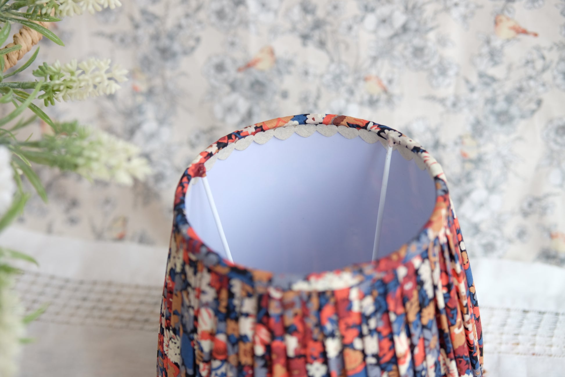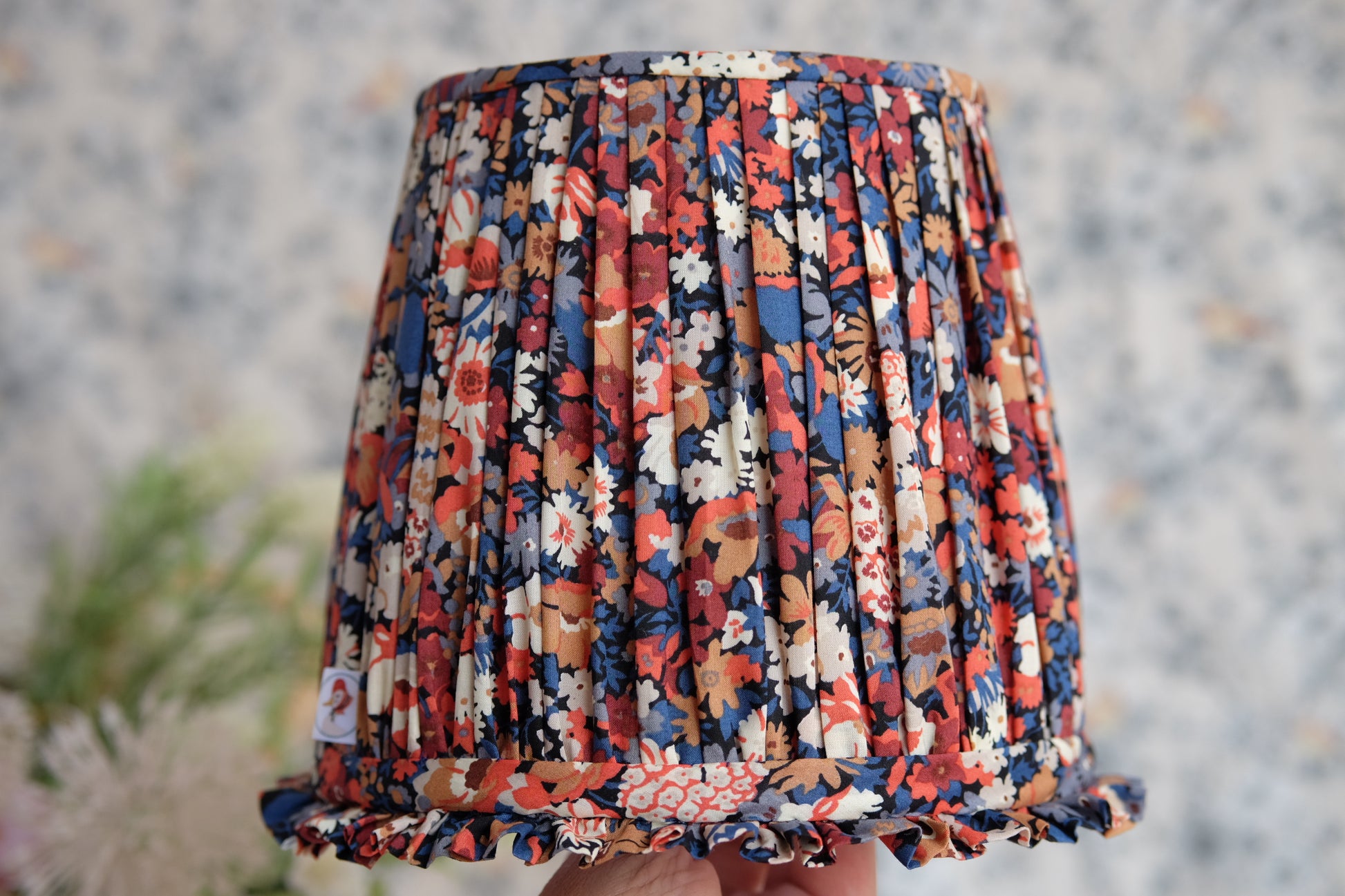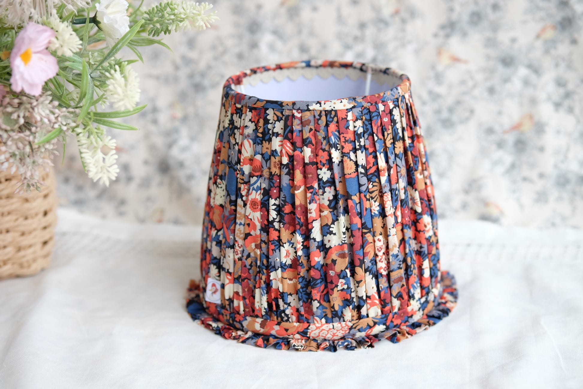 Tulipa fruncida en algodón de Liberty con estampado de flores en tonos caldera y azules. Ideal para lamparitas de mesilla o apliques de pared. Tiene un pequeño volante en la parte inferior.